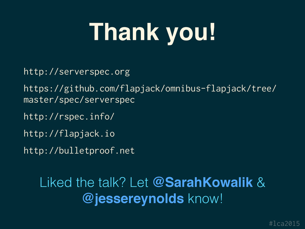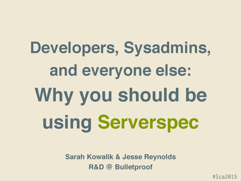 Sarah Kowalik and Jesse Reynolds Jan 13 2015, LCA 2015, Auckland A talk as part of the Miniconf: Developer, Testing, Release and Continuous Integration Automation http://linux.conf.au/schedule/30206/view_talk?day=tuesday