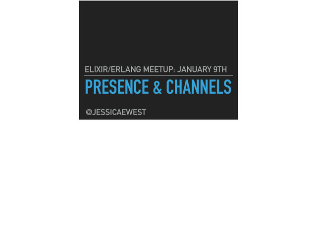 users, we need to implement users publishing messages. In our case, feels. PRESENCE & CHANNELS BY @JESSICAEWEST # web/channels/room_channel.ex We need to add a function to the RoomChannel module to handle new chat messages. What we’re doing here is listening for messages of the type "message:new" and broadcast!-ing them to everyone connected to the current room (including ourselves) after adding some additional metadata like who posted the message and when. This however, does not handle it alone. We need… MOAR JAVASCRIPT