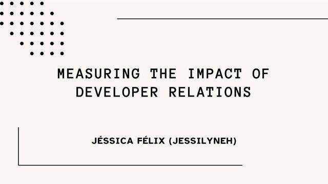 e Resolv (former) Social Media e Public Relations EW.IT (former) DevRel e community Manager da Shawee (former) Organizadora do Nerdzão desde 2019 Organizadora do CityJS Conf no Brasil Consultoria de Copywriting para Tech MEDINDO O IMPACTO DE DEVREL @jessilyneh