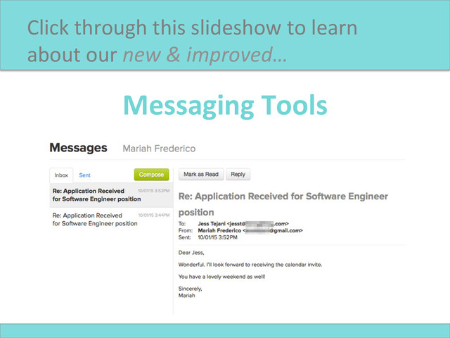 Sent tabs • Sleek new design • Unread messages alert on the applicant grid • One-‐click access to Messages from the applicant grid • Drag & drop aDachments • Mark as Read/Unread opGon