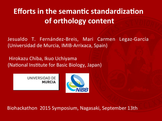 Jesualdo T. Fernández-‐Breis, Mari Carmen Legaz-‐García (Universidad de Murcia, IMIB-‐Arrixaca, Spain) Hirokazu Chiba, Ikuo Uchiyama (NaLonal InsLtute for Basic Biology, Japan) Biohackathon 2015 Symposium, Nagasaki, September 13th
