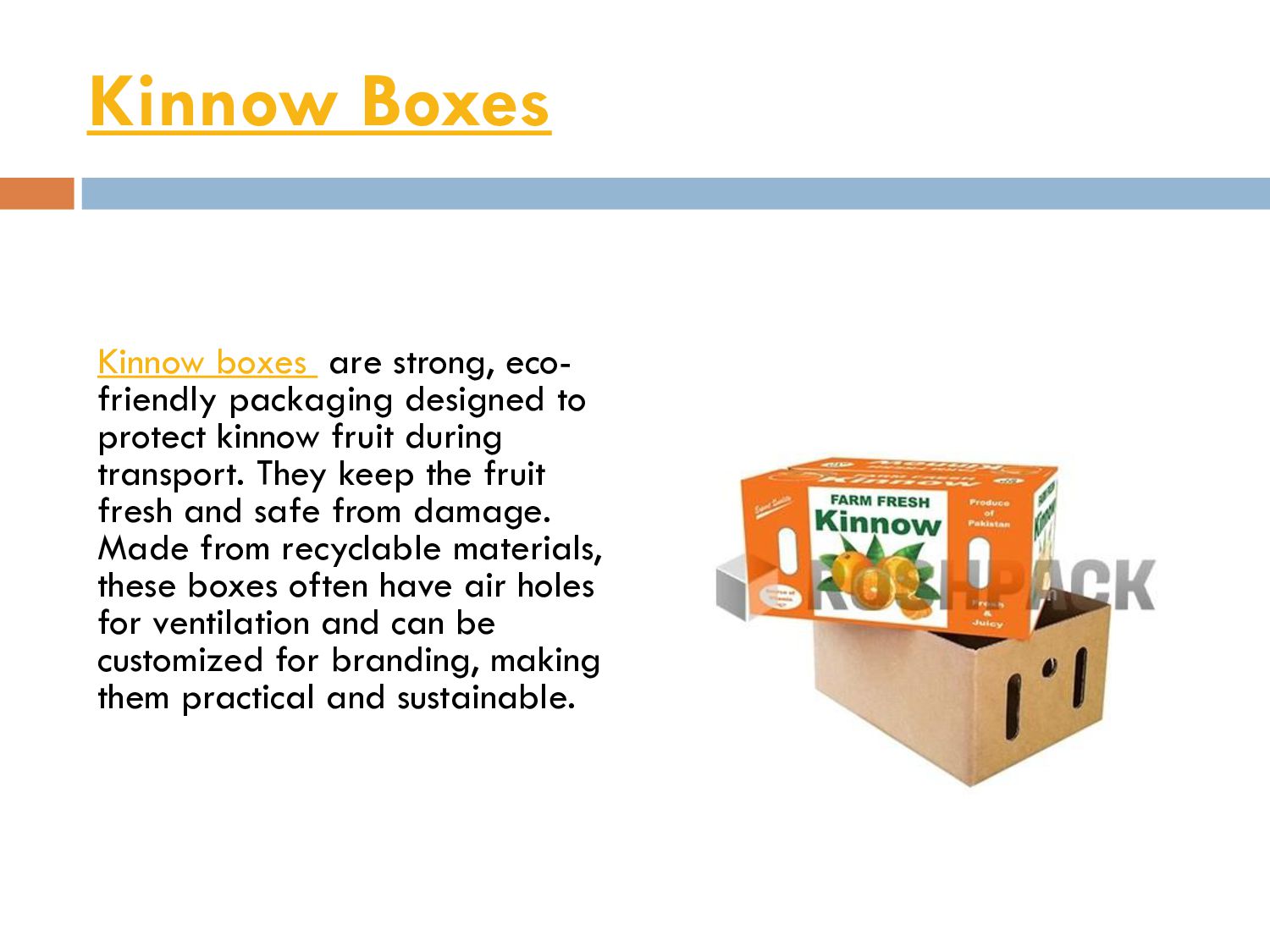 to protect kinnow fruit during transport. They keep the fruit fresh and safe from damage. Made from recyclable materials, these boxes often have air holes for ventilation and can be customized for branding, making them practical and sustainable.