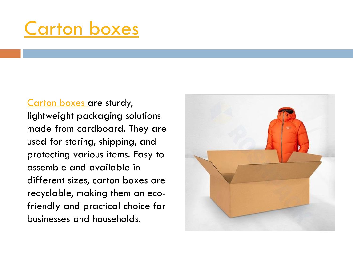 from cardboard. They are used for storing, shipping, and protecting various items. Easy to assemble and available in different sizes, carton boxes are recyclable, making them an eco- friendly and practical choice for businesses and households.
