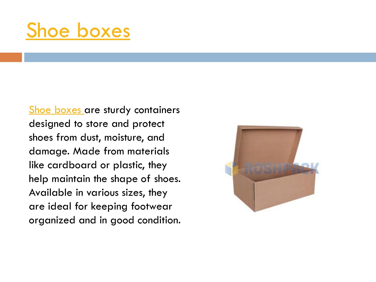 and protect shoes from dust, moisture, and damage. Made from materials like cardboard or plastic, they help maintain the shape of shoes. Available in various sizes, they are ideal for keeping footwear organized and in good condition.