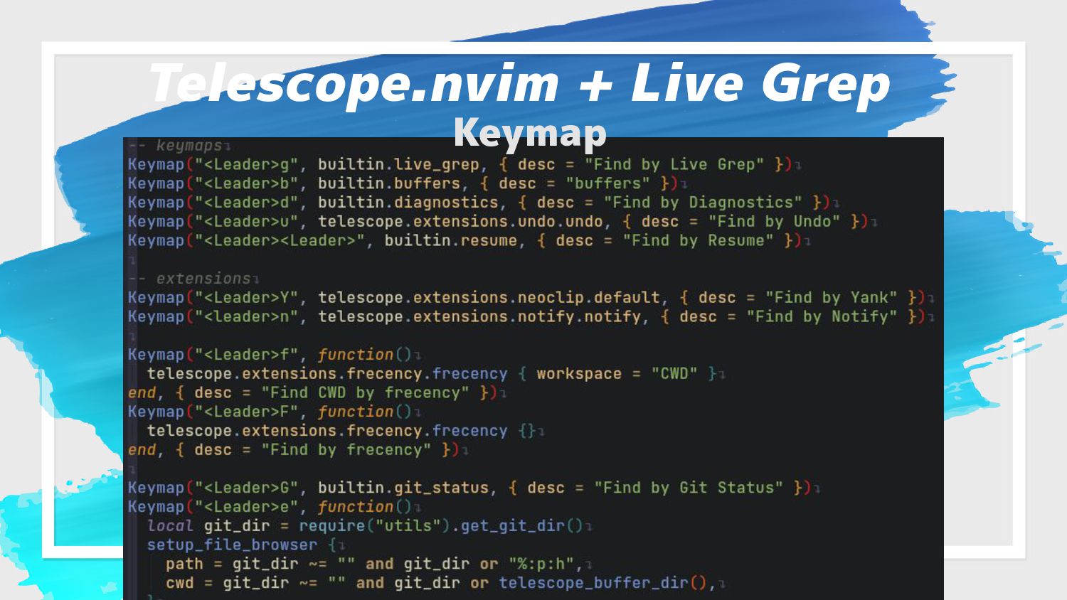 コード解析、自動補完 → LSP & lspsaga.nvim • 構文解析 → nvim-treesitter • 補完エンジン → nvim-cmp • ファジーファインダー → fzf & Telescope.nvim • AI支援 → CopilotChat.nvim プラグイン 令和最新版