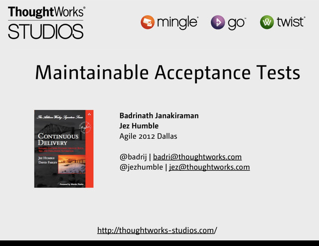 Creating automated end-to-end functional acceptance tests is hard. Maintaining them over time is harder. Some agilistas even claim that the cost outweighs the benefit. In this lecture we present five principles for creating valuable, maintainable acceptance test suites. We discuss practices such as layering acceptance tests to reduce coupling between the test harness, and talk about how teams should be organized in order to efficiently manage acceptance test driven development. The core of the talk discusses how to manage the evolution of acceptance tests by organizing them as scenarios rather than as suites of story tests. Finally we show how to manage data for acceptance tests.