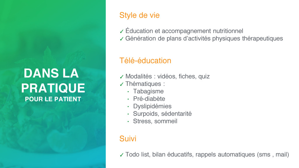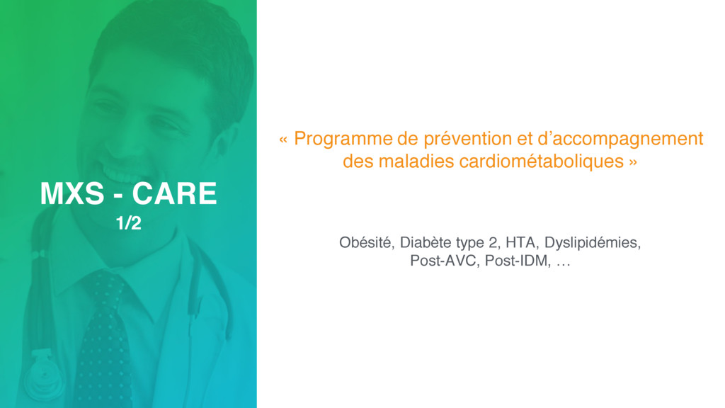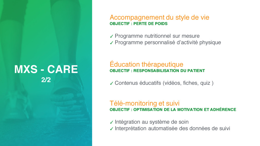 ✓ Programme nutritionnel sur mesure ✓ Programme personnalisé d’activité physique Éducation thérapeutique OBJECTIF : RESPONSABILISATION DU PATIENT ✓ Contenus éducatifs (vidéos, fiches, quiz ) Télé-monitoring et suivi OBJECTIF : OPTIMISATION DE LA MOTIVATION ET ADHÉRENCE ✓ Intégration au système de soin ✓ Interprétation automatisée des données de suivi MXS - CARE 2/2