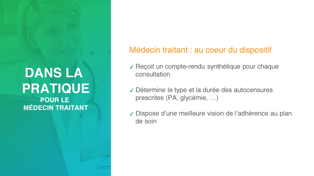 compte-rendu synthétique pour chaque consultation ✓ Détermine le type et la durée des autocensures prescrites (PA, glycémie, …) ✓ Dispose d’une meilleure vision de l’adhérence au plan de soin DANS LA PRATIQUE POUR LE MÉDECIN TRAITANT