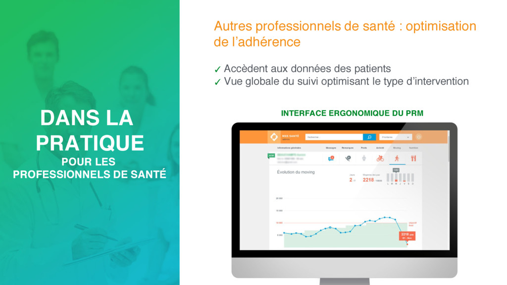 aux données des patients ✓ Vue globale du suivi optimisant le type d’intervention DANS LA PRATIQUE POUR LES PROFESSIONNELS DE SANTÉ INTERFACE ERGONOMIQUE DU PRM