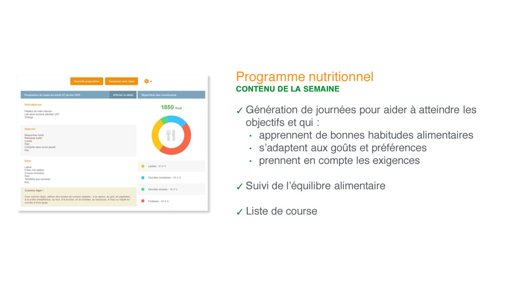 pour aider à atteindre les objectifs et qui : • apprennent de bonnes habitudes alimentaires • s’adaptent aux goûts et préférences • prennent en compte les exigences ✓ Suivi de l’équilibre alimentaire ✓ Liste de course
