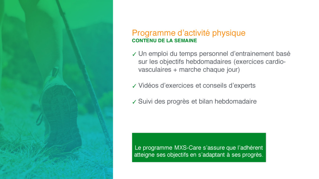 du temps personnel d’entrainement basé sur les objectifs hebdomadaires (exercices cardio- vasculaires + marche chaque jour) ✓ Vidéos d’exercices et conseils d’experts ✓ Suivi des progrès et bilan hebdomadaire Le programme MXS-Care s’assure que l’adhérent atteigne ses objectifs en s’adaptant à ses progrès.