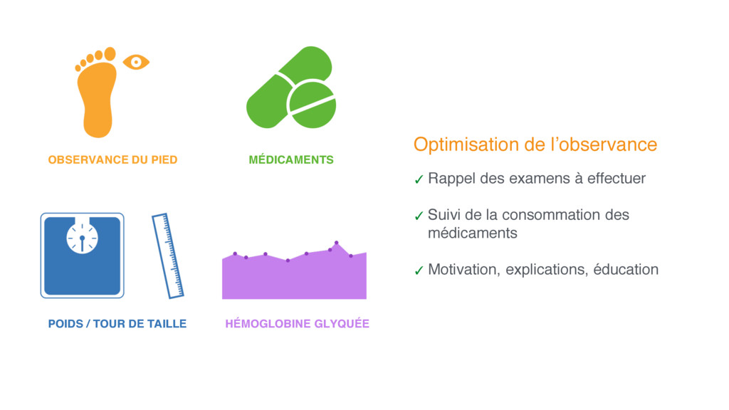 Suivi de la consommation des médicaments ✓ Motivation, explications, éducation OBSERVANCE DU PIED MÉDICAMENTS POIDS / TOUR DE TAILLE HÉMOGLOBINE GLYQUÉE