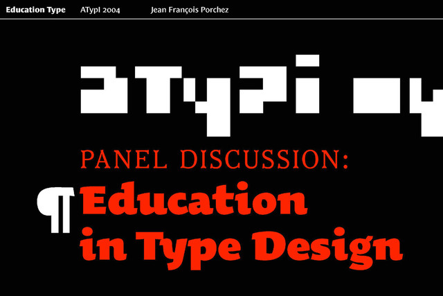 Sharing experience during ATypI 2004 about education in type design. Typefaces presented: Amiens, Arcis, Artamis, Bazaar, Bertrand, Bitmp, Caffeine, Caocao, Cargoth, Cooker Black, Erkaji, Gange, Jannet, Jarkko, Metis, Poincons, Recreation, Rosart, Sanguinet, Triade, Zinzolin… http://old.atypi.org/08_Prague.html