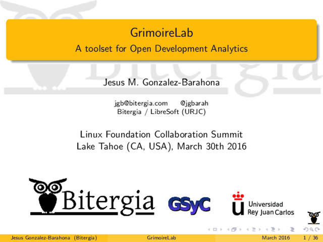 [email protected] @jgbarah Bitergia / LibreSoft (URJC) Linux Foundation Collaboration Summit Lake Tahoe (CA, USA), March 30th 2016 Jesus Gonzalez-Barahona (Bitergia) GrimoireLab March 2016 1 / 36