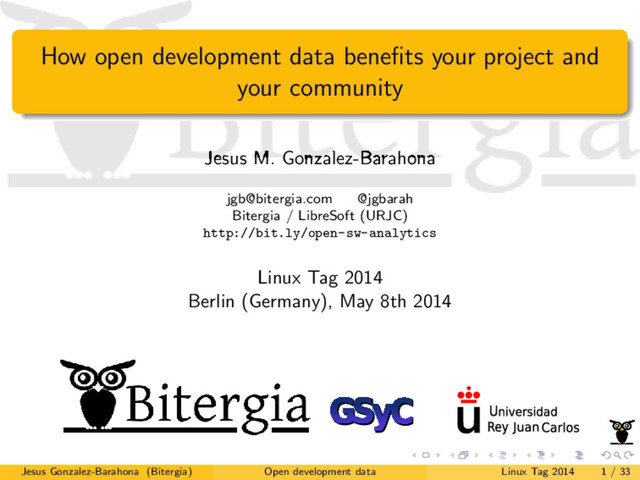 The presentation will be based on the Grimoire technology, which will be used as an excuse to discuss software development analytics, and open development data, in general.