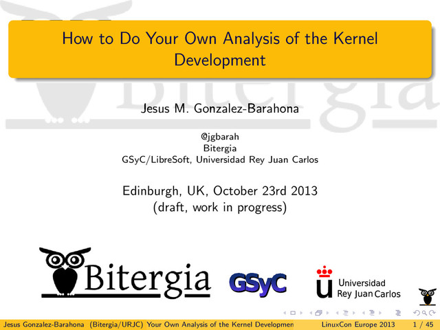 Jesus M. Gonzalez-Barahona @jgbarah Bitergia GSyC/LibreSoft, Universidad Rey Juan Carlos Edinburgh, UK, October 23rd 2013 (draft, work in progress) Jesus Gonzalez-Barahona (Bitergia/URJC) Your Own Analysis of the Kernel Development LinuxCon Europe 2013 1 / 45