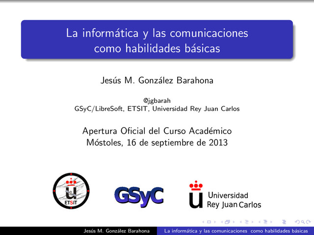 Jes´ us M. Gonz´ alez Barahona @jgbarah GSyC/LibreSoft, ETSIT, Universidad Rey Juan Carlos Apertura Oficial del Curso Acad´ emico M´ ostoles, 16 de septiembre de 2013 Jes´ us M. Gonz´ alez Barahona La inform´ atica y las comunicaciones como habilidades b´ asicas