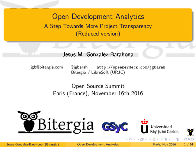 http://2017.msrconf.org 14th International Conference on Mining Software Repositories Co-located with ICSE Buenos Aires, Argentina Save the dates: May 20-21 2017 Start the conversation!!! #msr17 Jesus Gonzalez-Barahona (Bitergia) Open Development Analytics Paris, Nov 2016 51 / 54