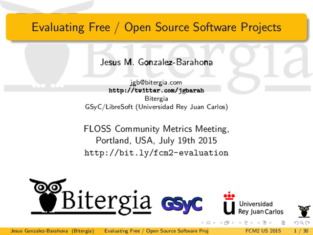 [email protected] http://twitter.com/jgbarah Bitergia GSyC/LibreSoft (Universidad Rey Juan Carlos) FLOSS Community Metrics Meeting, Portland, USA, July 19th 2015 http://bit.ly/fcm2-evaluation Jesus Gonzalez-Barahona (Bitergia) Evaluating Free / Open Source Software Projects FCM2 US 2015 1 / 30