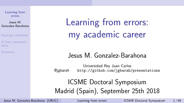 personal) story Summary Starting conditions Having the right mentors Jesus M. Gonzalez-Barahona (URJC) Learning from errors ICSME Doctoral Symposium 8 / 49