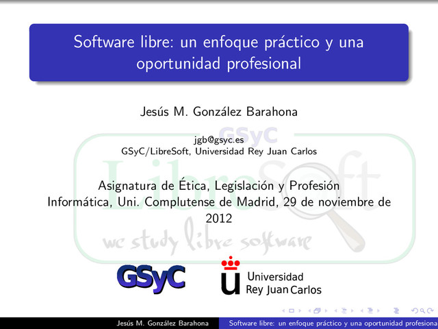 Presentación "Software libre: un enfoque práctico y una oportunidad profesional" en la asignatura "Ética, Legislación y Profesión" de las titulaciones de informática de la Universidad Complutense de Madrid. En el pasado he usado el mismo juego de transparencias, u otras muy parecidas, en varias presentaciones relacionadas con el espinoso asunto de cómo se puede vivir de (y con) el software libre.