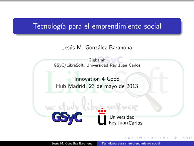 alez Barahona @jgbarah GSyC/LibreSoft, Universidad Rey Juan Carlos Innovation 4 Good Hub Madrid, 23 de mayo de 2013 Jes´ us M. Gonz´ alez Barahona Tecnolog´ ıa para el emprendimiento social