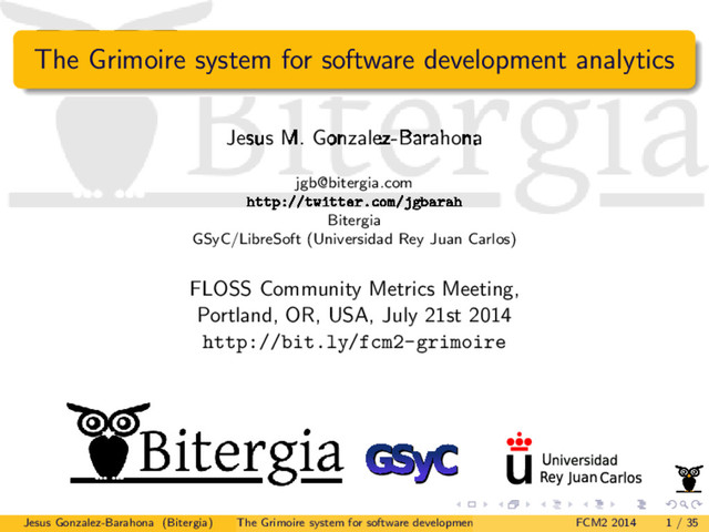 Presentation at FLOSS Community Metrics Meeting, Portland, OR, USA, July 21st 2014.