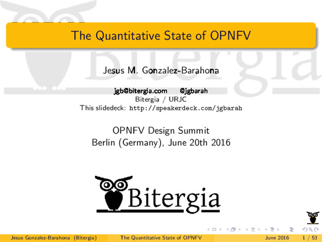Bitergia / URJC This slidedeck: http://speakerdeck.com/jgbarah OPNFV Design Summit Berlin (Germany), June 20th 2016 Jesus Gonzalez-Barahona (Bitergia) The Quantitative State of OPNFV June 2016 1 / 53