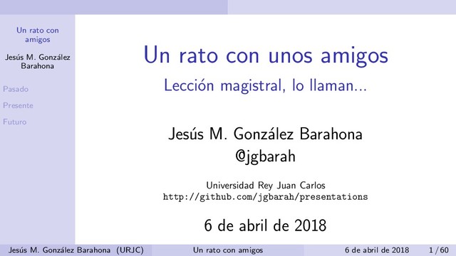 Pasado Presente Futuro Un rato con unos amigos Lecci´ on magistral, lo llaman... Jes´ us M. Gonz´ alez Barahona @jgbarah Universidad Rey Juan Carlos http://github.com/jgbarah/presentations 6 de abril de 2018 Jes´ us M. Gonz´ alez Barahona (URJC) Un rato con amigos 6 de abril de 2018 1 / 60