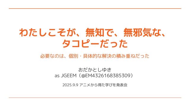 わたしこそが、無知で、無邪気な、 タコピーだった 必要なのは、個別・具体的な解決の積み重ねだった おだかとしゆき as JGEEM(@EM4326168385309) 2025.9.9 アニメから得た学びを発表会