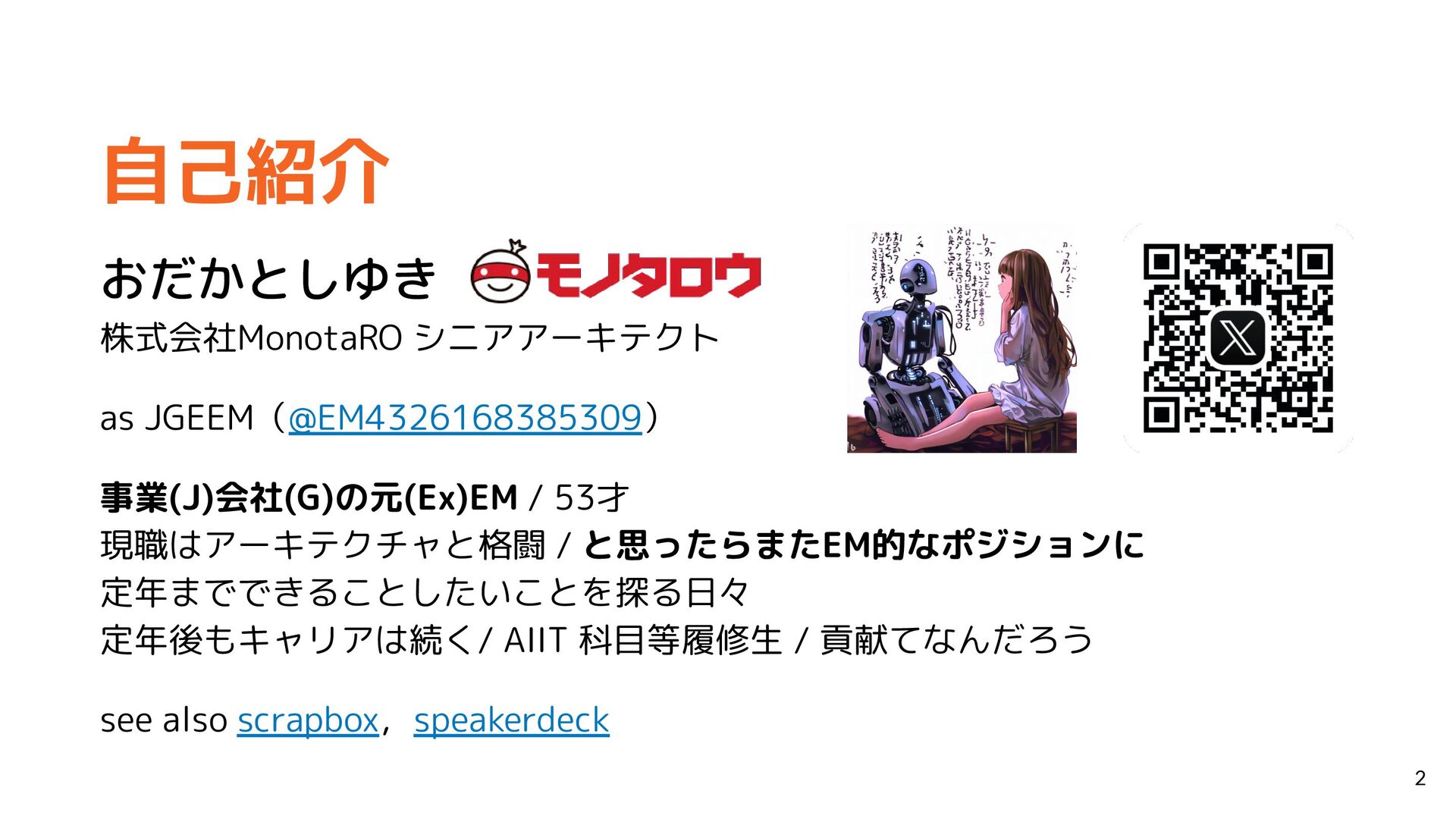 自己紹介 おだかとしゆき 株式会社MonotaRO シニアアーキテクト as JGEEM(@EM4326168385309) 事業(J)会社(G)の元(Ex)EM / 53才 現職はアーキテクチャと格闘