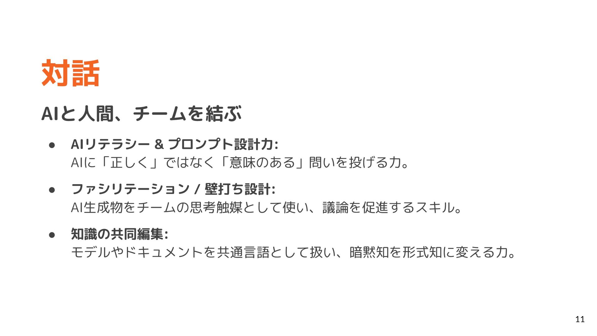 壁打ち設計: AI生成物をチームの思考触媒として使い、議論を促進するスキル。 • 知識の共同編集: モデルやドキュメントを共通言語として扱い、暗黙知を形式知に変える力。 11