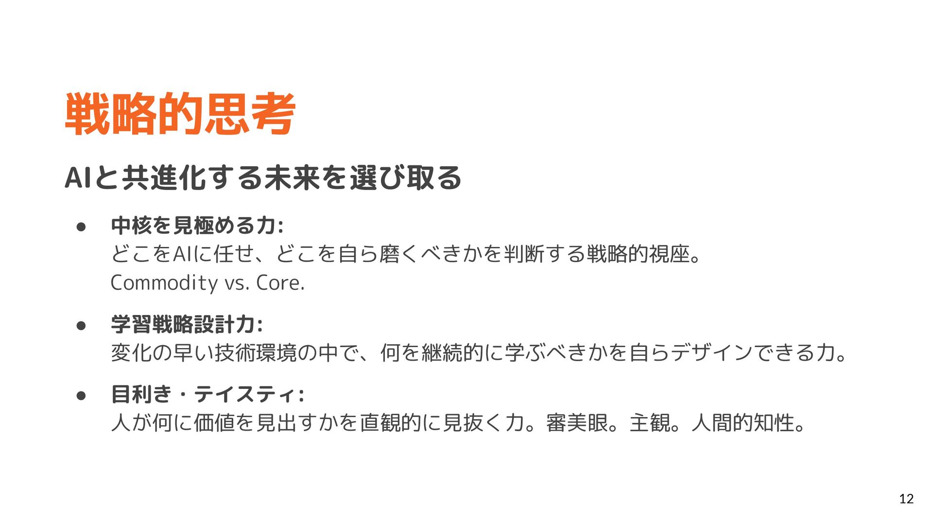 戦略的思考 AIと共進化する未来を選び取る • 中核を見極める力: どこをAIに任せ、どこを自ら磨くべきかを判断する戦略的視座。 Commodity vs. Core. • 学習戦略設計力: