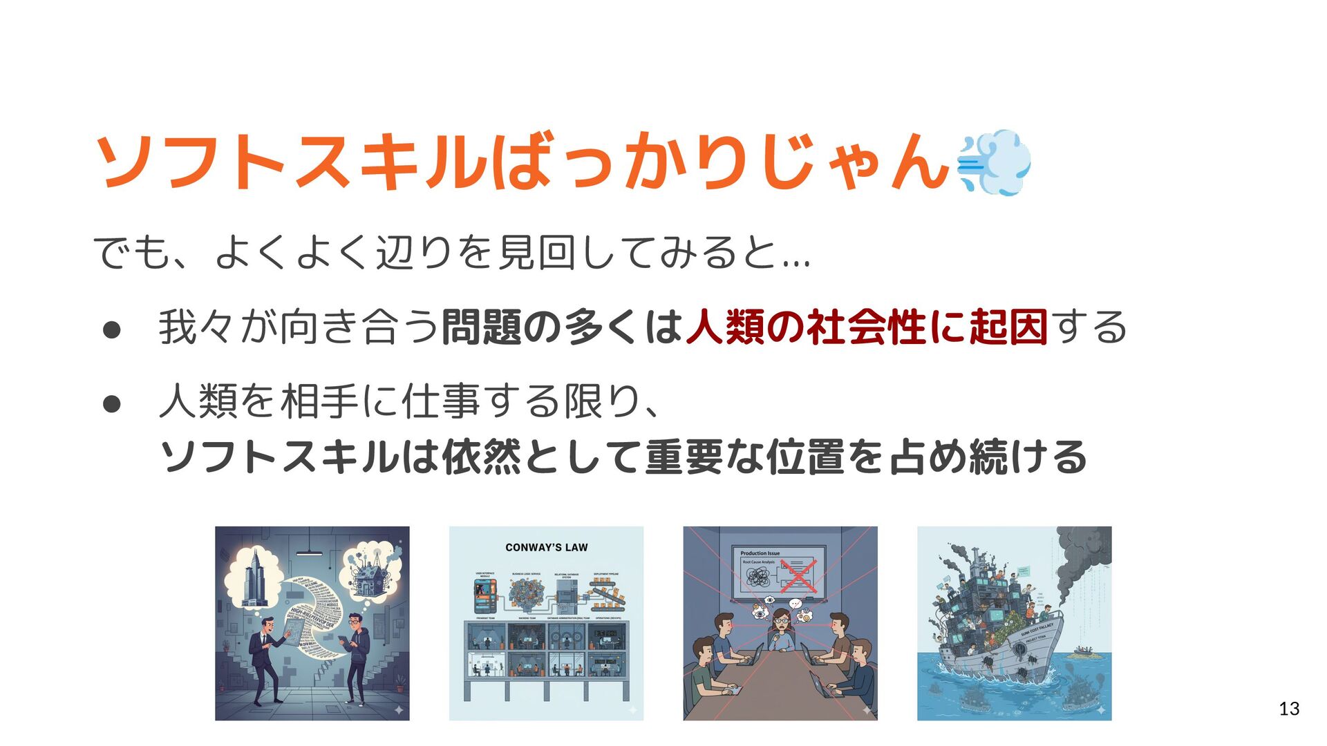 ソフトスキルばっかりじゃん💨 でも、よくよく辺りを見回してみると... • 我々が向き合う問題の多くは人類の社会性に起因する • 人類を相手に仕事する限り、 ソフトスキルは依然として重要な位置を占め続ける 13