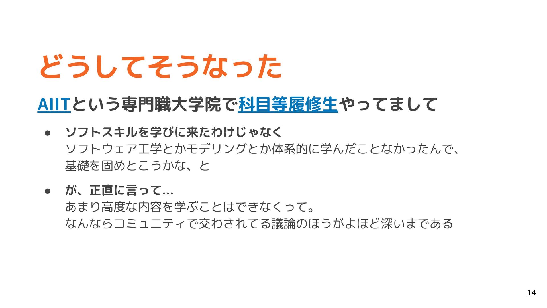 どうしてそうなった AIITという専門職大学院で科目等履修生やってまして • ソフトスキルを学びに来たわけじゃなく ソフトウェア工学とかモデリングとか体系的に学んだことなかったんで、 基礎を固めとこうかな、と • が、正直に言って... あまり高度な内容を学ぶことはできなくって。 なんならコミュニティで交わされてる議論のほうがよほど深いまである