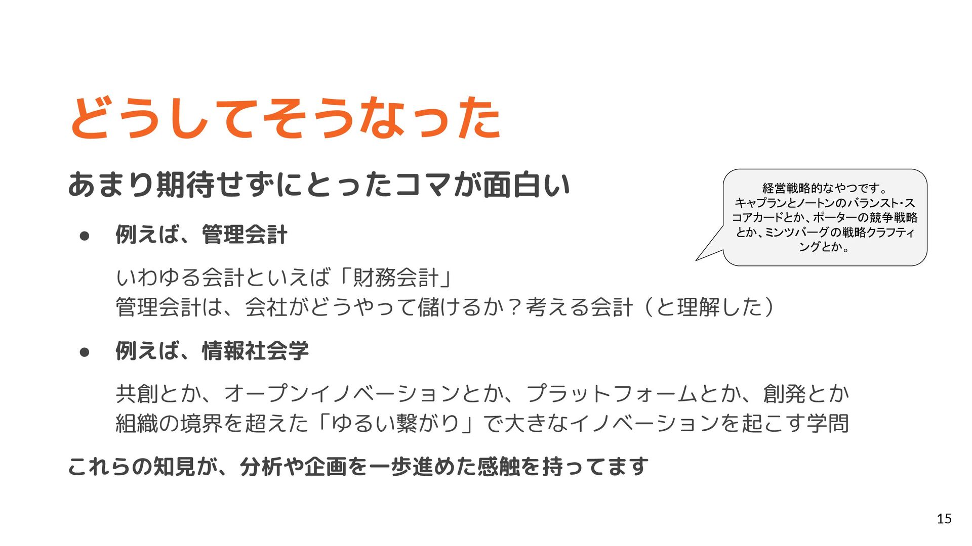 どうしてそうなった あまり期待せずにとったコマが面白い • 例えば、管理会計 いわゆる会計といえば「財務会計」 管理会計は、会社がどうやって儲けるか?考える会計(と理解した) • 例えば、情報社会学 共創とか、オープンイノベーションとか、プラットフォームとか、創発とか 組織の境界を超えた「ゆるい繋がり」で大きなイノベーションを起こす学問