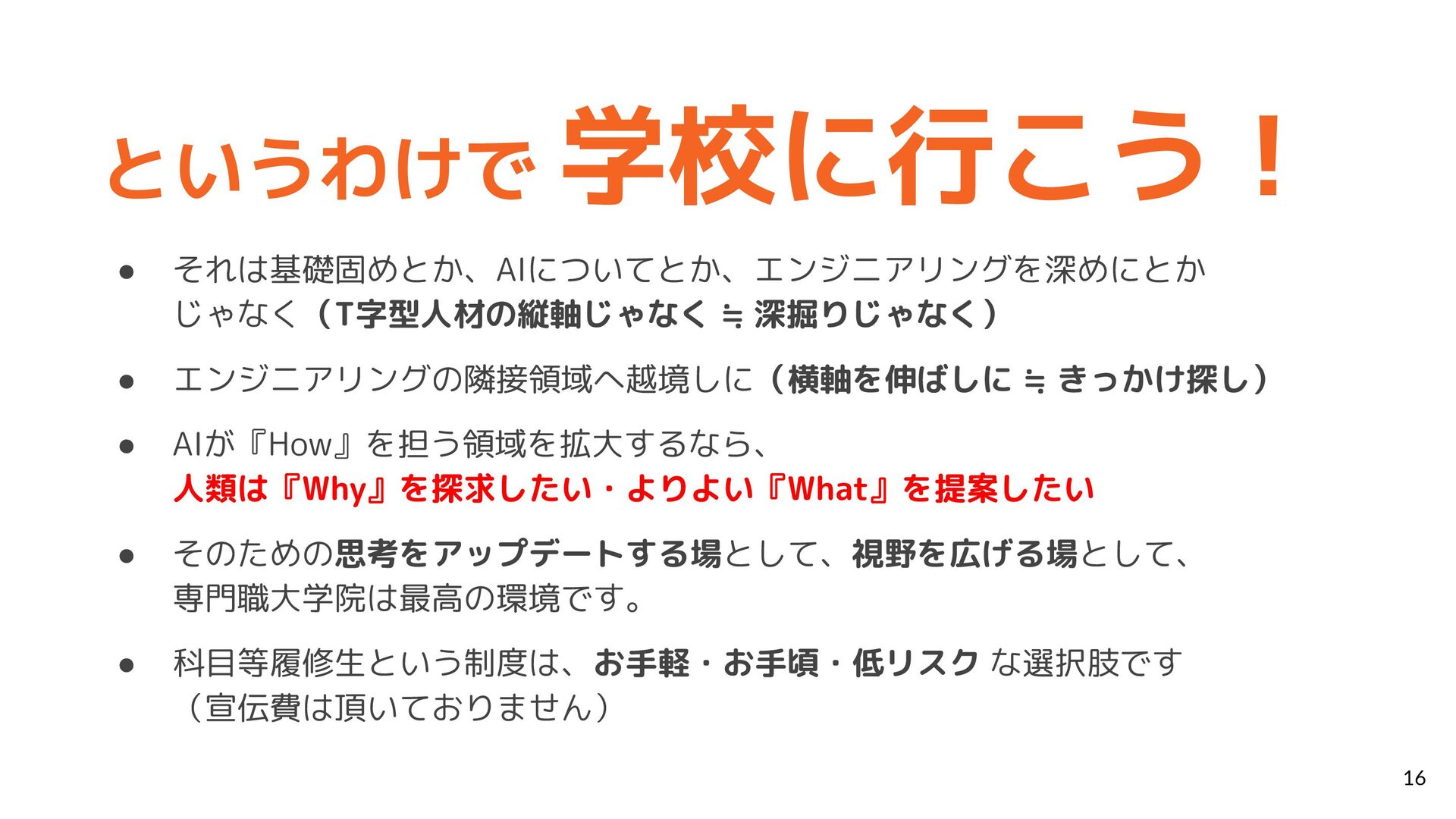 というわけで 学校に行こう! • それは基礎固めとか、AIについてとか、エンジニアリングを深めにとか じゃなく(T字型人材の縦軸じゃなく ≒ 深掘りじゃなく) • エンジニアリングの隣接領域へ越境しに(横軸を伸ばしに ≒