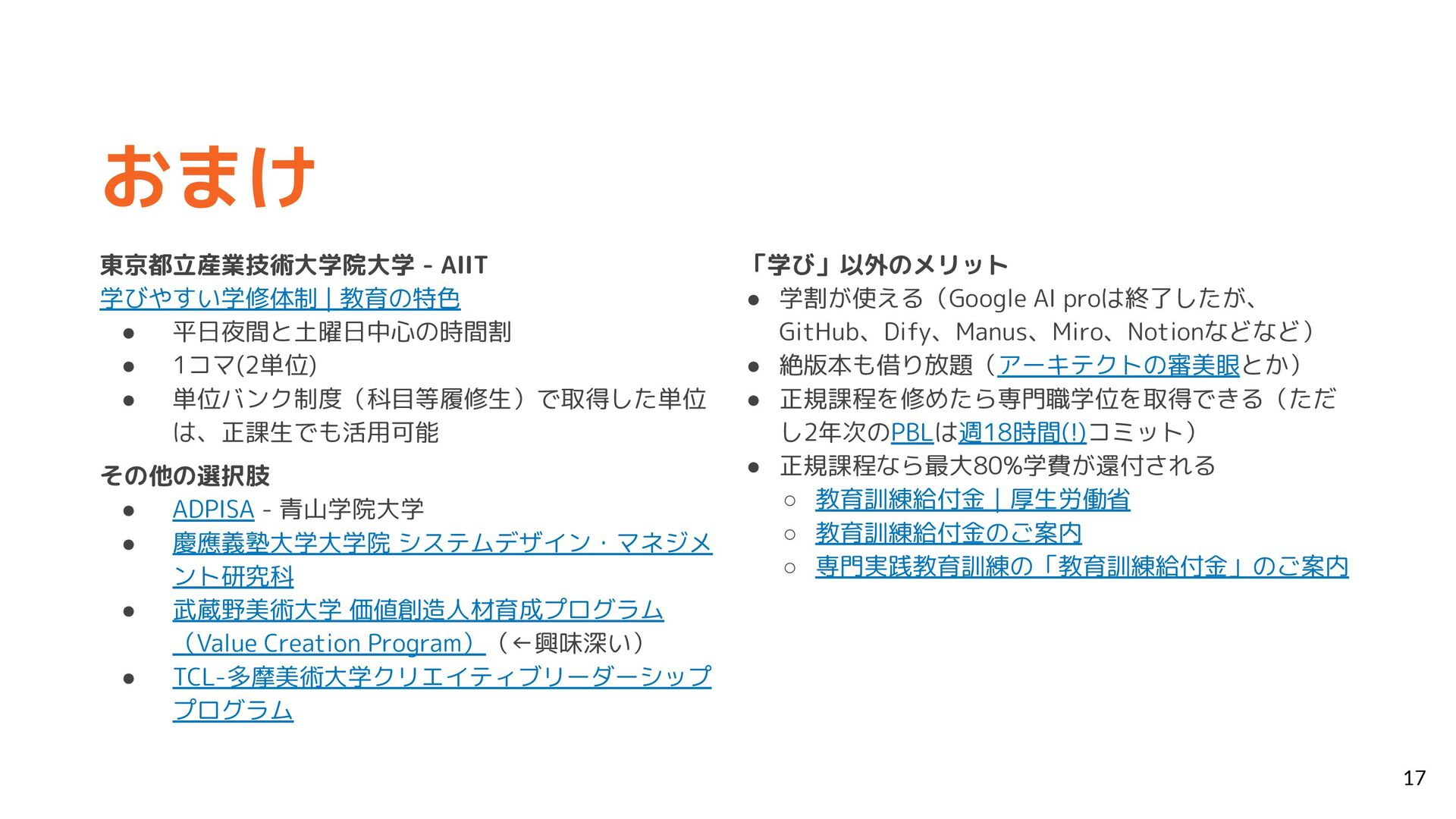 1コマ(2単位)から ≒ 90分x週2x約2か月 • 単位バンク制度(科目等履修生)で取得した単位 は、正課生でも活用可能 その他の選択肢 • ADPISA - 青山学院大学 • 慶應義塾大学大学院 システムデザイン・マネジメ ント研究科 • 武蔵野美術大学 価値創造人材育成プログラム (Value Creation Program)(←興味深い) • TCL-多摩美術大学クリエイティブリーダーシップ プログラム 17 「学び」以外のメリット • 学割が使える(Google AI proは終了したが、 GitHub、Dify、Manus、Miro、Notionなどなど) • 絶版本も借り放題(アーキテクトの審美眼とか) • 正規課程を修めたら専門職学位を取得できる(ただ し2年次のPBLは週18時間(!)コミット) • 正規課程なら最大80%学費が還付される ◦ 教育訓練給付金|厚生労働省 ◦ 教育訓練給付金のご案内 ◦ 専門実践教育訓練の「教育訓練給付金」のご案内