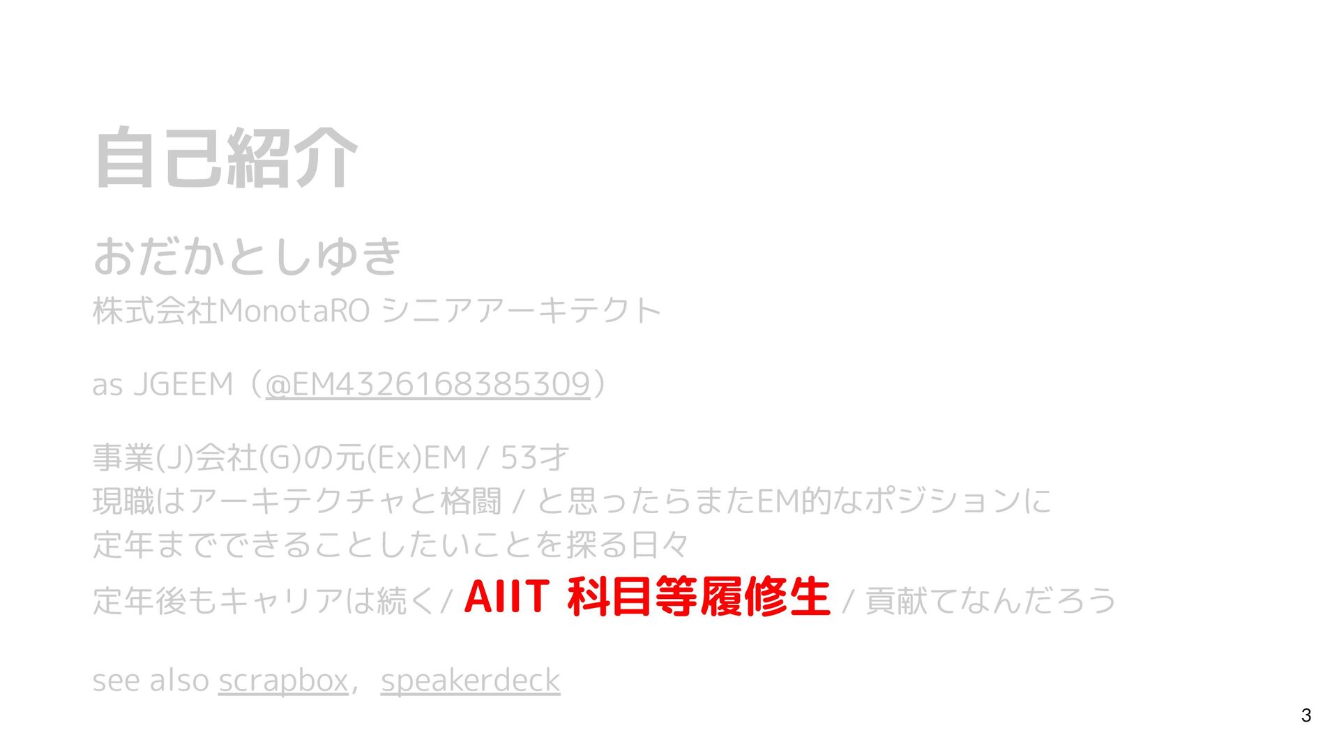 / と思ったらまたEM的なポジションに 定年までできることしたいことを探る日々 定年後もキャリアは続く/ AIIT 科目等履修生 / 貢献てなんだろう see also scrapbox,speakerdeck 3
