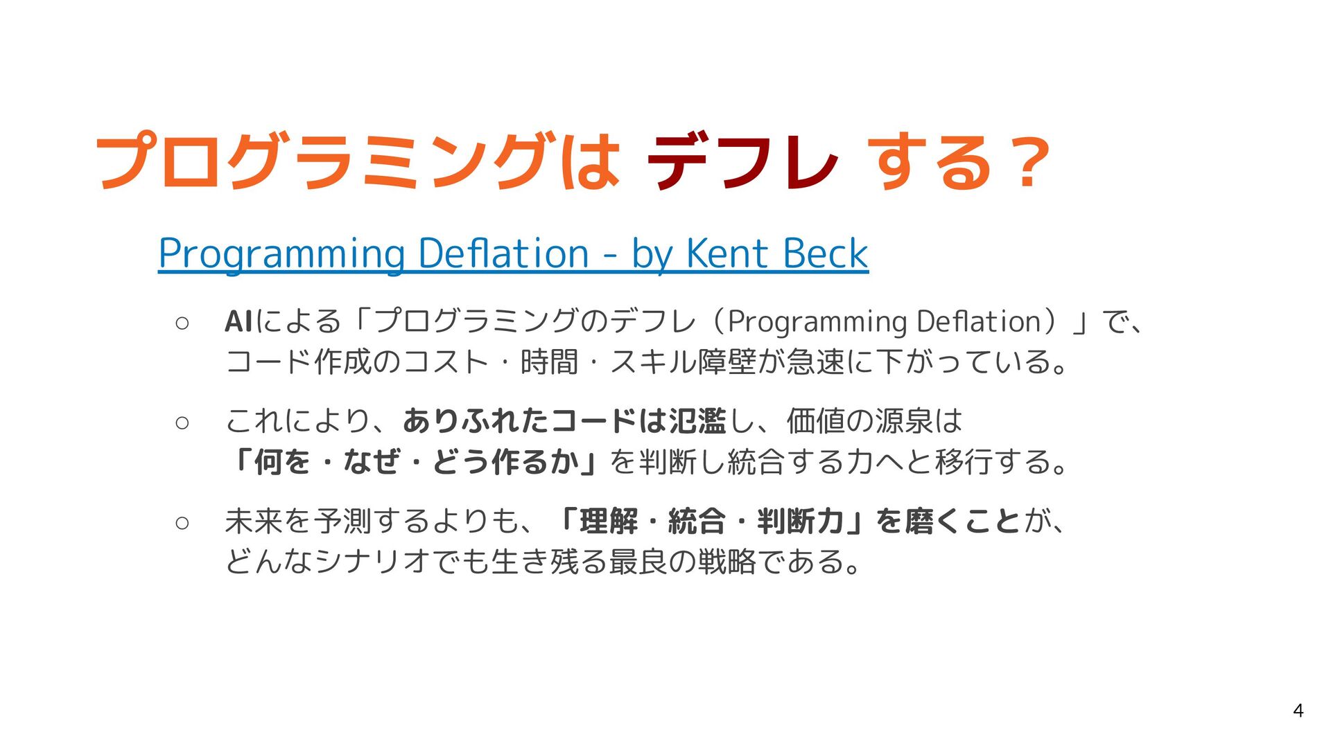 AIによる「プログラミングのデフレ(Programming Deflation)」で、 コード作成のコスト・時間・スキル障壁が急速に下がっている。 ◦ これにより、ありふれたコードは氾濫し、価値の源泉は 「何を・なぜ・どう作るか」を判断し統合する力へと移行する。 ◦ 未来を予測するよりも、「理解・統合・判断力」を磨くことが、 どんなシナリオでも生き残る最良の戦略である。 4