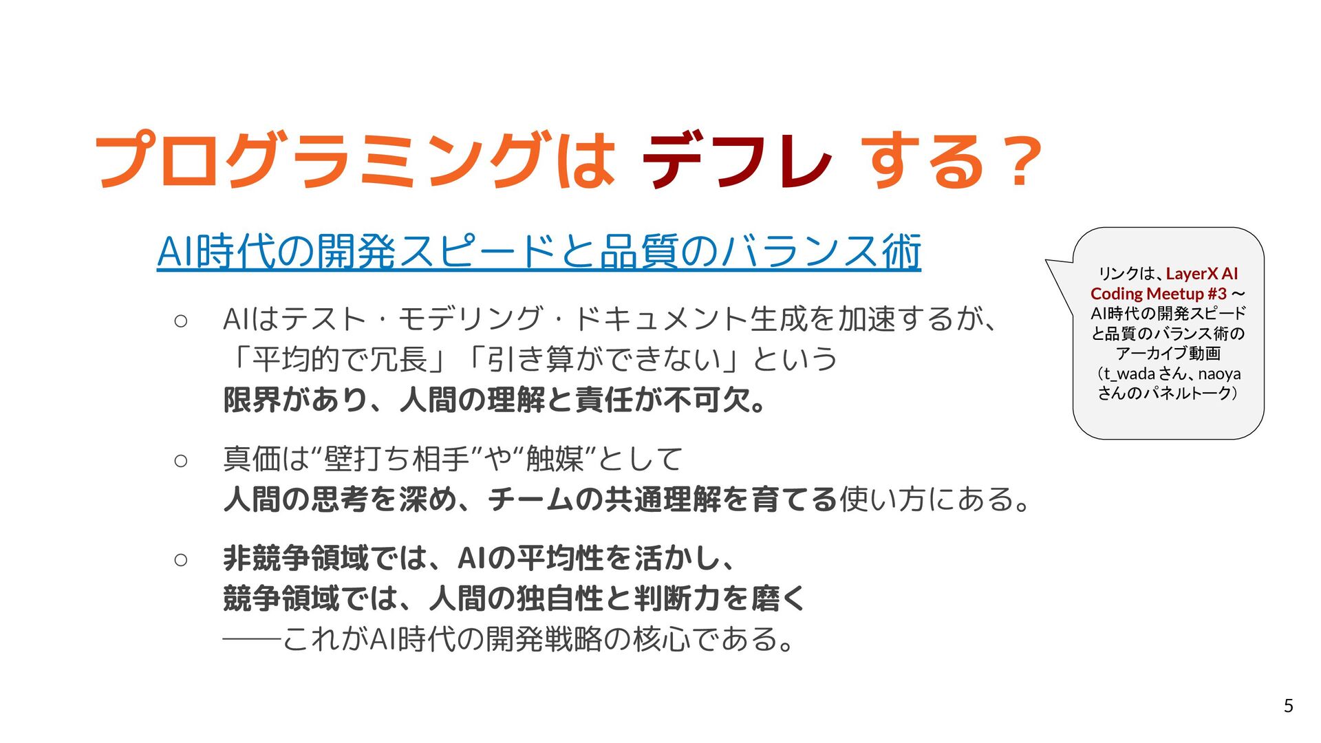 人間の思考を深め、チームの共通理解を育てる使い方にある。 ◦ 非競争領域では、AIの平均性を活かし、 競争領域では、人間の独自性と判断力を磨く ──これがAI時代の開発戦略の核心である。 5 リンクは、LayerX AI Coding Meetup #3 〜 AI時代の開発スピード と品質のバランス術の アーカイブ動画 (t_wada さん、naoya さんのパネルトーク)
