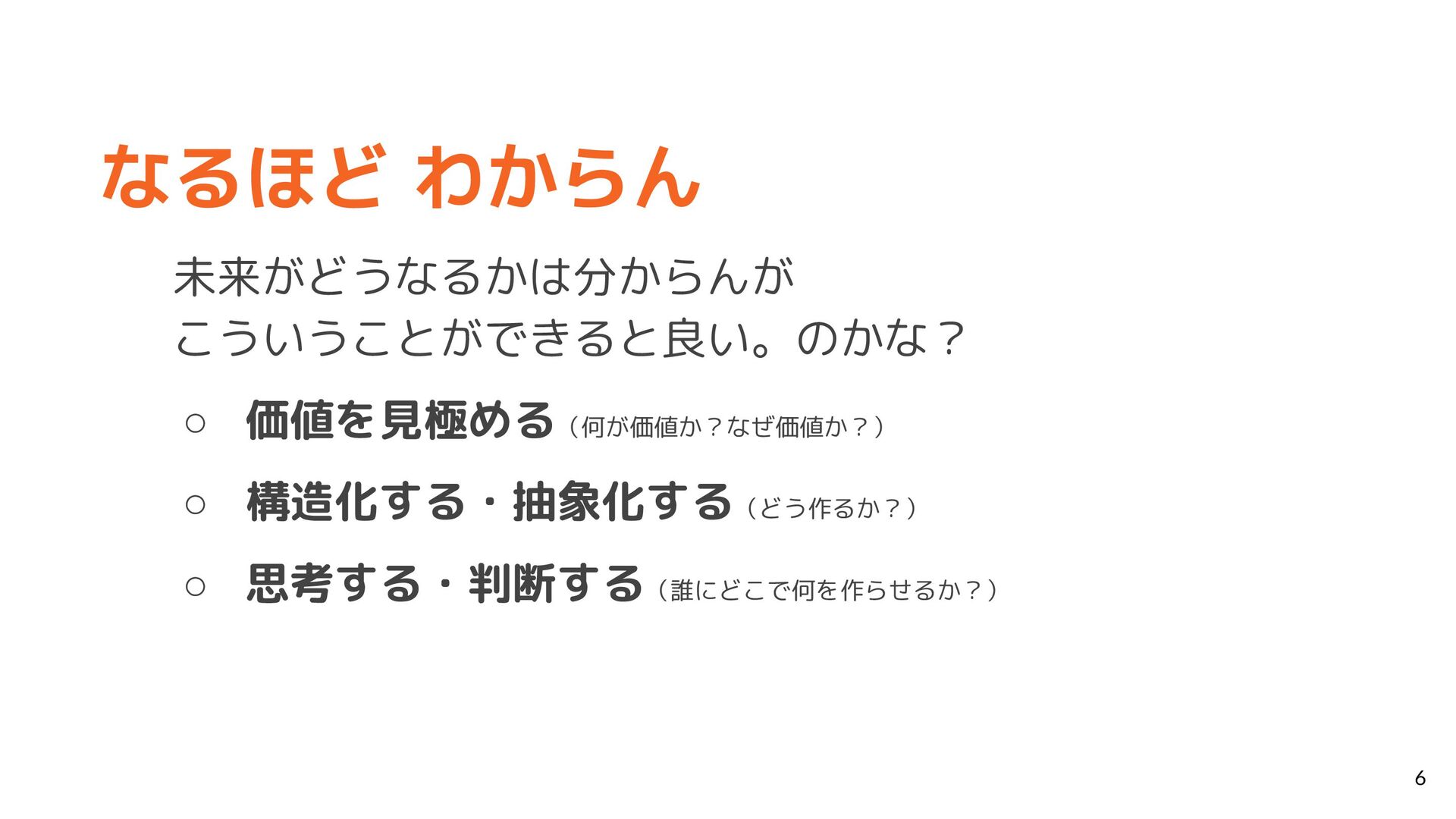 なるほど わからん 未来がどうなるかは分からんが こういうことができると良い。のかな? ◦ 価値を見極める(何が価値か?なぜ価値か?) ◦ 構造化する・抽象化する(どう作るか?) ◦ 思考する・判断する(誰にどこで何を作らせるか?)
