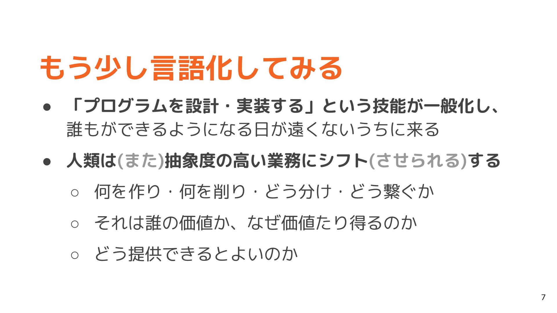 もう少し言語化してみる • 「プログラムを設計・実装する」という技能が一般化し、 誰もができるようになる日が遠くないうちに来る • 人類は(また)抽象度の高い業務にシフト(させられる)する ◦ 何を作り・何を削り・どう分け・どう繋ぐか ◦ それは誰の価値か、なぜ価値たり得るのか
