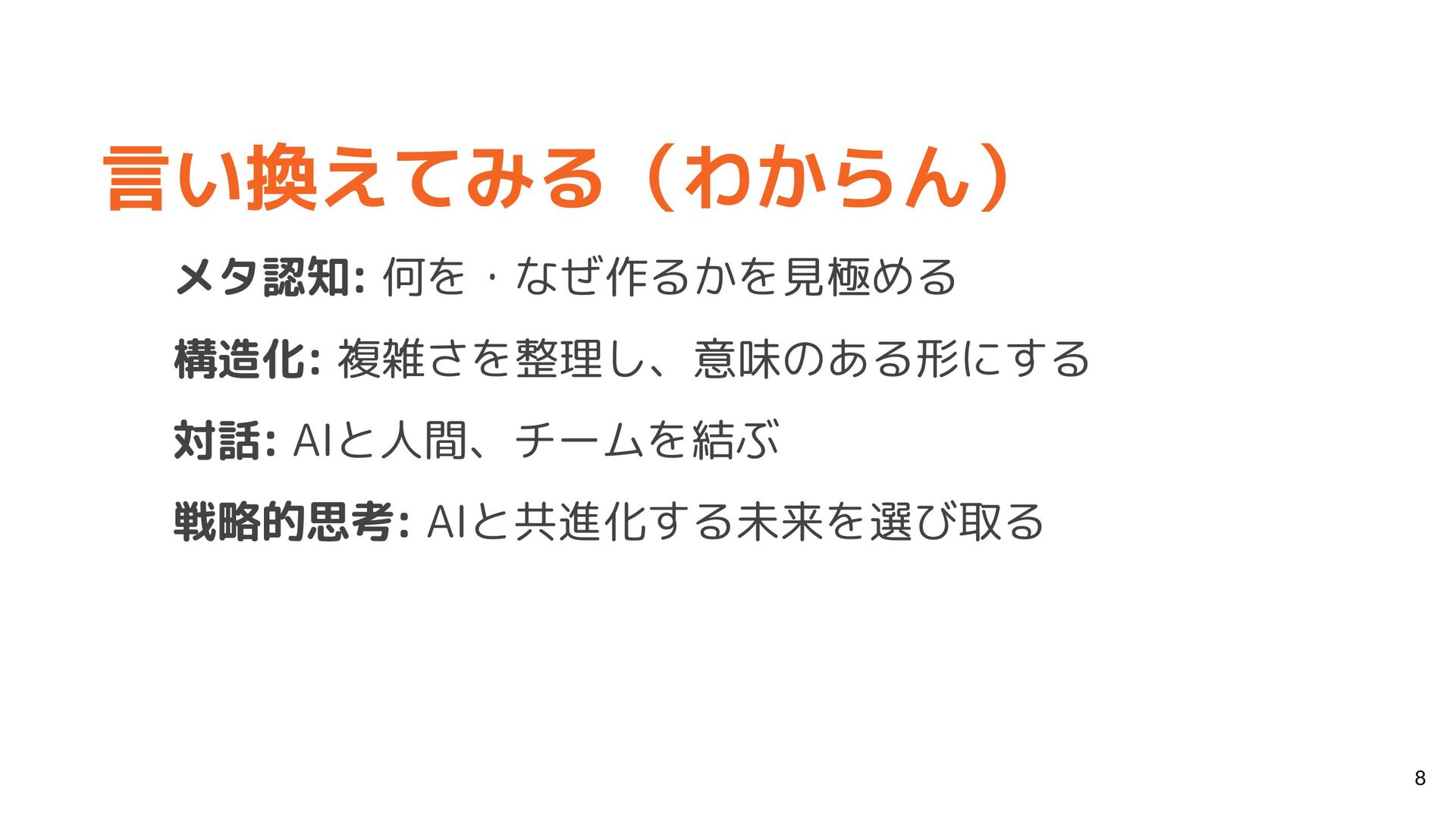 言い換えてみる(わからん) メタ認知: 何を・なぜ作るかを見極める 構造化: 複雑さを整理し、意味のある形にする 対話: AIと人間、チームを結ぶ 戦略的思考: AIと共進化する未来を選び取る 8