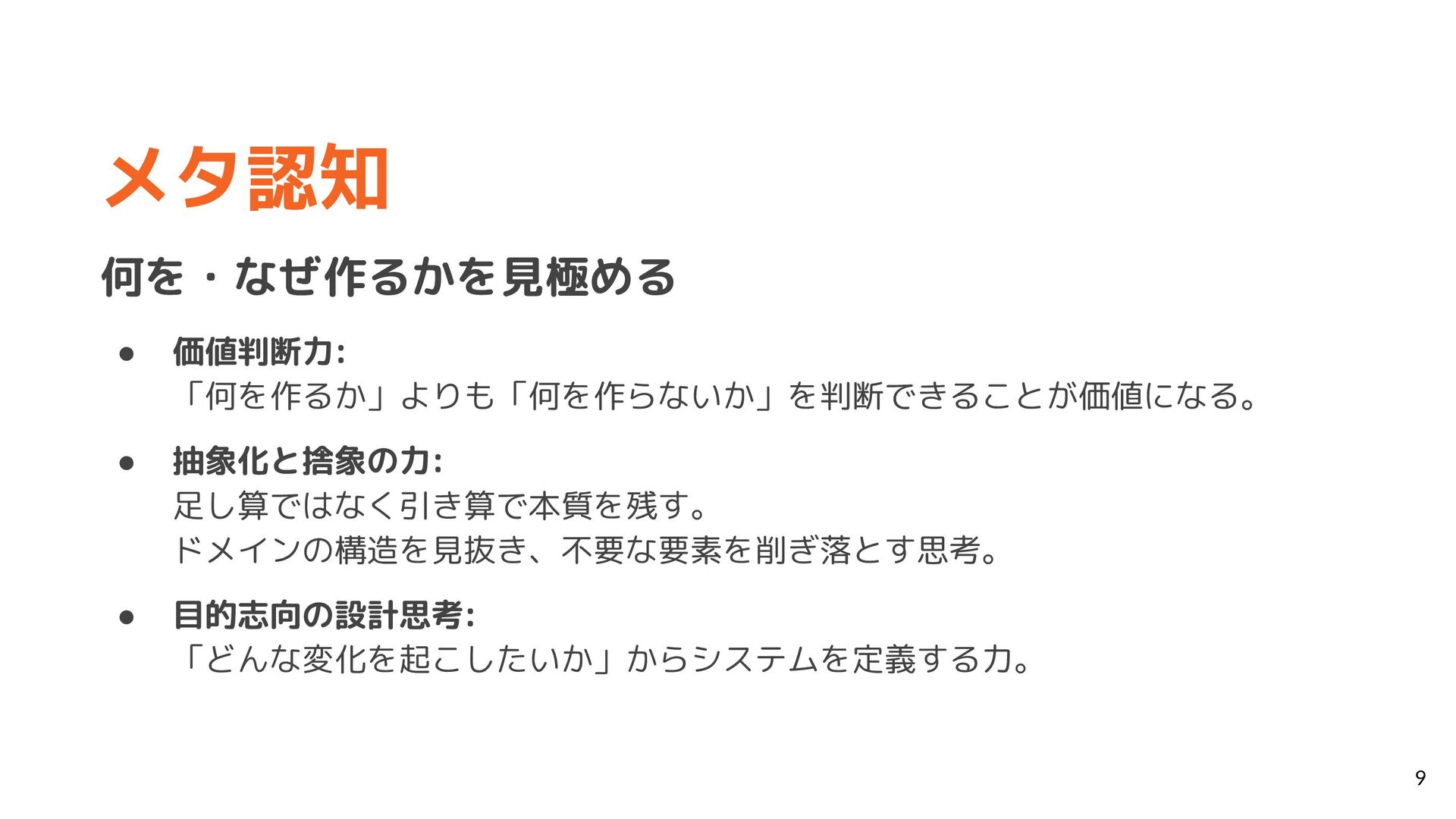 メタ認知 何を・なぜ作るかを見極める • 価値判断力: 「何を作るか」よりも「何を作らないか」を判断できることが価値になる。 • 抽象化と捨象の力: 足し算ではなく引き算で本質を残す。 ドメインの構造を見抜き、不要な要素を削ぎ落とす思考。 •
