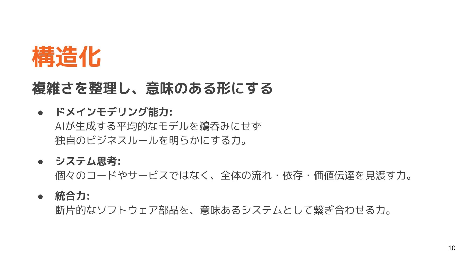 構造化 複雑さを整理し、意味のある形にする • ドメインモデリング能力: AIが生成する平均的なモデルを鵜呑みにせず、主観を形にする力。 独自のビジネスルールを明らかにする力。 • システム思考: 個々のコードやサービスではなく、全体の流れ・依存・価値伝達を見渡す力。 •