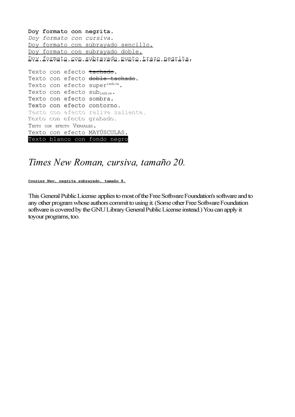 con subrayado sencillo. Doy formato con subrayado doble. Doy formato con subrayado punto trazo negrita. Texto con efecto tachado. Texto con efecto doble tachado. Texto con efecto superíndice. Texto con efecto subíndice . Texto con efecto sombra. Texto con efecto sombra. Texto con efecto contorno. Texto con efecto relive saliente. Texto con efecto relive saliente. Texto con efecto grabado. Texto con efecto grabado. TEXTO CON EFECTO VERSALES. Texto con efecto MAYÚSCULAS. Texto blanco con fondo negro Times New Roman, cursiva, tamaño 20. Courier New, negrita subrayado, tamaño 8. This General Public License applies to most of the Free Software Foundation's software and to any other program whose authors commit to using it. (Some other Free Software Foundation software is covered by the GNU Library General Public License instead.) Y ou can apply it toyour programs, too.