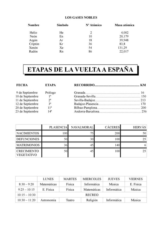 He 2 4,002 Neón En 10 20,179 Argón Ar 18 39,948 Criptón Kr 36 83,8 Xenón Xe 54 131,29 Radón Rn 86 22,017 ETAPAS DE LA VUELTA A ESPAÑA FECHA ETAPA RECORRIDO....................................................... KM 9 de Septiembre Prólogo Granada................................................................... 16 10 de Septiembre 1ª Granada-Sevilla....................................................... 150 11 de Septiembre 2ª Sevilla-Badajoz....................................................... 213 12 de Septiembre 3ª Badajoz-Plasencia................................................... 170 20 de Septiembre 11ª Bilbao-Pamplona..................................................... 200 23 de Septiembre 14ª Andorra-Barcelona................................................... 256 PLASENCIA NAVALMORAL CÁCERES HERVÁS NACIMIENTOS 100 75 200 50 DEFUNCIONES 50 30 100 25 MATRIMONIOS 36 45 140 6 CRECIMIENTO VEGETATIVO 50 45 100 25 LUNES MARTES MIERCOLES JUEVES VIERNES 8:30 – 9:20 Matemáticas Física Informática Música E. Física 9:25 – 10:15 E. Física Física Matemáticas Informática Música 10:15 – 10:30 RECREO 10:30 – 11:20 Astronomía Teatro Religión Informática Música
