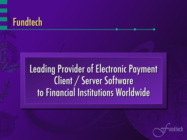 Bankers Trust California Commerce Bank California Federal Bank Chase Manhattan Bank Citizens Bank City National Bank Colonial BancGroup 1st Business Bank Foothill Independent Bank Glendale Federal S&L GreenPoint Bank Home Savings of America U.S. Banks (Cont.) Imperial Bank JP Morgan Private Banking MBNA America Bank National Bank of Alaska Southwest Corporate Federal Credit Union Washington Mutual Wilmington Trust Non-U.S. Banks Colonial State Bank Israel Discount Bank Swedbank (U.K.) Agency Banks Banco Atlantico Banco De Credito Del Peru Dai-Ichi Kangyo Bank Fuji Bank and Trust Company Sumitomo Bank Swedbank (New York) Large Business Enterprises Fidelity Investments Merrill Lynch Visa International