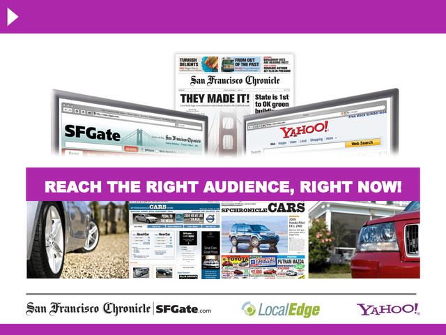 capturing users based on their activity on the Yahoo! and SFGate networks is the cornerstone of audience-based advertising. • Life Cycles: The more your prospects use Yahoo! and SFGate, the more we learn about their interests and behavior. • And the quality of our insights gets richer each time a prospect clicks on any item and drills down further in the buying cycle. • We can predict where customers are currently in the Life Cycle and help maximize ROI by targeting customers most likely to buy, trying to reclaim customers who are losing interest and not waste money on customers unlikely to do business with you. • We deliver the audiences you want to reach, allowing you to put the right ad, in front of the right person, at the right time.